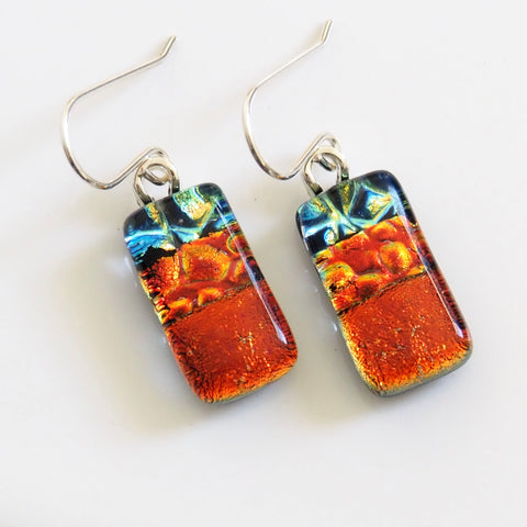 Orange and blue dichroic glass earrings. These earrings have a mottled pattern in blue and orange, with a plain orange area at the bottom, made from shiny sparkling dichroic glass.