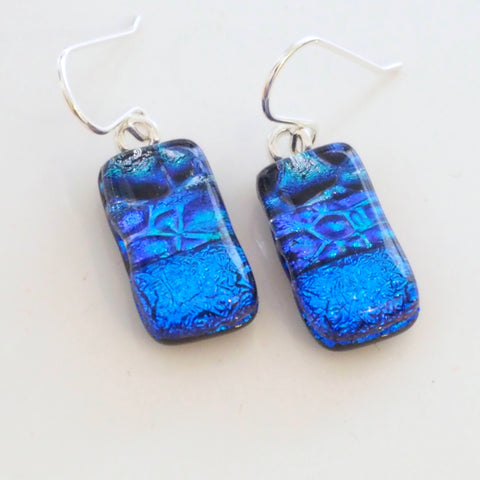 Blue fused glass earrings. These earrings have bands of blue in 3 sections, plain blue, blue and turquoise and navy blue. The earrings are made form dichroic glass and art glass, kiln fused.