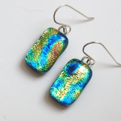 Blue green yellow fused glass earrings. These earrings have rivers of blue with yellow and green, made from kiln fused dichroic glass.