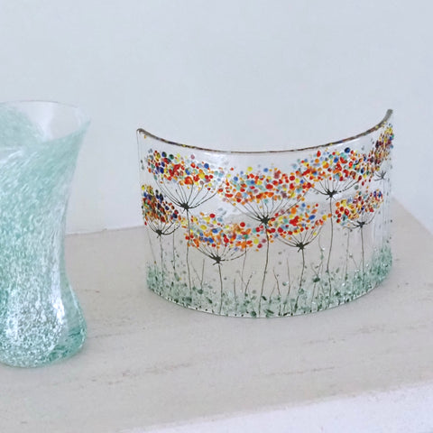 A fused glass candle screen curve with a design of rainbow flowers on a clear glass background. The flowers are in vibrant colours, and the stems are drawn in enamel, with specks of green sprinkled over the whole piece to catch the light.
