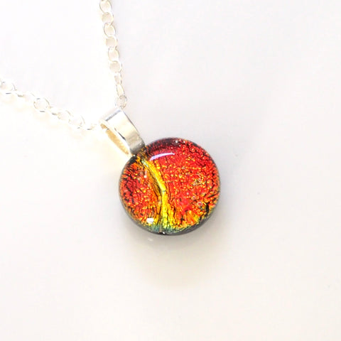 Orange and yellow fused dichroic glass pendant. This pendant is made from a textured dichroic glass, in orange with a golden yellow streak.