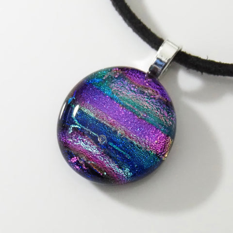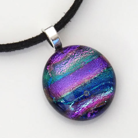 Pink purple teal fused oval dichroic glass pendant. A colourful pendant with bands of purple-pink with teal and a touch of silver. Handmade from dichroic glass and art glass, which I have kiln fused.