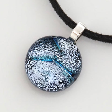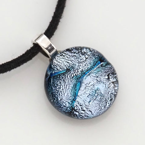 Silver fused dichroic glass pendant. This round pendant is silver dichroic with a streak of blue running across. Handmade from dichroic glass and art glass, which I have kiln fused.