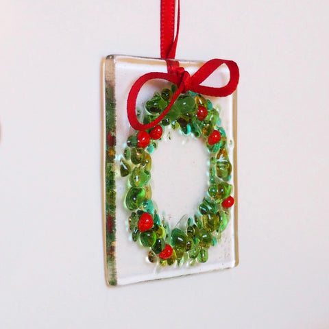 A greetings card with a glass wreath on a fused glass square. I have uses several shades of green glass pieces, and red for berries which I have kiln fused to the base glass. The heat of the kiln allows the glass pieces to soften and fuse together. The glass can be removed and hung on your tree with the attached ribbon.