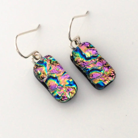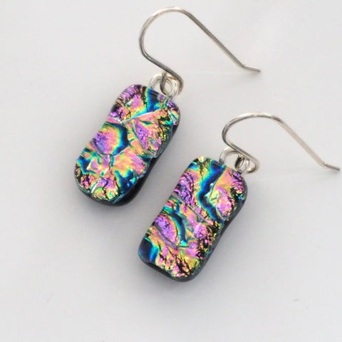 Pink, gold and blue dichroic glass earrings. These very sparkly earrings are made entirely from glass with a pretty rippled pattern under clear smooth glass.
